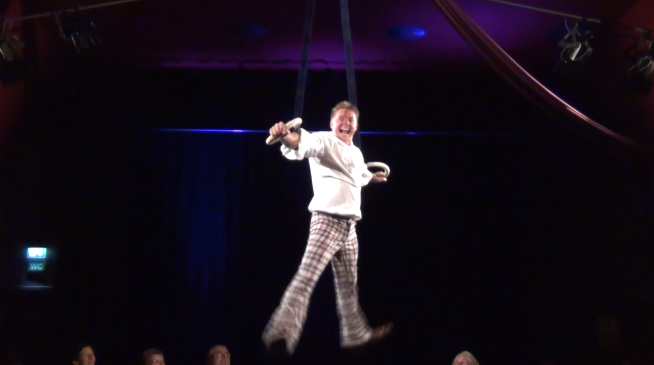 Im schicken Siebziger-Jahre-Outfit kämpft er mit den Tücken des Geräts. Nonchalant überspielt er Beinahe-Abstürze, Schuhverluste und andere Kalamitäten, um am Ende mit Kraft und Geschick zu siegen. Mit großem komödiantischem Talent und außergewöhnlichem turnerischen Können zeigt Mr. van Dee Sport-Akrobatik in Perfektion.